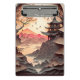 A beautiful brown mini clipboard with a paper cutout scene depicting ancient Chinese building, trees, mountains and lake.