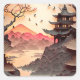 A beautiful brown square sticker with a paper cutout scene depicting ancient Chinese building, trees, mountains and lake.