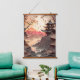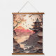 A beautiful brown wood topped tapestry with a paper cutout scene depicting ancient Chinese building, trees, mountains and lake.