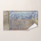 Ancient chronicles inspired, practical, unique, brown, blue, grey abstract pattern hand towel, featuring an angel, scripts and dots, and custom short text at the upper right corner, designed by JChristiansen.