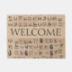 This custom welcome mat features an ancient Egyptian art theme. A series of Egyptian hieroglyphics are printed across a parchment paper style background.