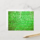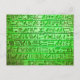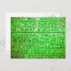 A postcard with ancient hieroglyphs engraved on stone in green. Cracks can be seen on the left.