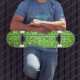 A green skateboard with ancient hieroglyphs engraved on stone. Super cool.