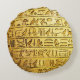 A yellow round pillow with ancient hieroglyphs engraved on stone.