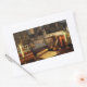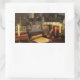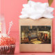 A surreal 3D play on perspective created in Vue. In the background is a quiet mediaeval city street in late afternoon, the warm glow of the setting sun enhanced by the lamps burning along the walls. Half-timbered houses and inns with thatched roofs line the street, and behind them is visible against the sky a tall, square tower with four corner turrets. This large-scale scene merges into a smaller foreground still life showing a desk littered with books. The books are as tall as the stone wall and houses they lean against, and the cobblestone street fades smoothly into the wood grain of the table. In addition to the books there sits on the desk a feather pen and ink bottle, a compass, an hourglass, a mounted magnifying glass, and a parchment letter with an official seal. Two candles light the desk with a soft glow as the lamps light the street.