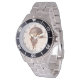 Has heft and feel of expensive stainless steel quartz watches. Good band with safety catch. I removed links, which is easy because engraved arrows show direction to push the linking pins. As always by this seller, the image (a railroad logo) is a perfect reproduction of my emailed image, and is precisely spaced and aligned.