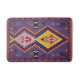 A vibrant, symmetrical fine art illustration inspired by traditional Andalusian weaving, featuring bold geometric diamonds in deep violet, saffron, and soft pink, accented with intricate tribal-style motifs and a classic red decorative border.