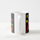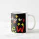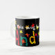 A classic white mug for someone called Andrew with a handpainted paper collage of the name, Andrew, sprinkled with red and yellow stars, on a black background.