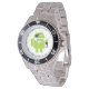 Has heft and feel of expensive stainless steel quartz watches. Good band with safety catch.  I removed links, which is easy because engraved arrows show direction to push the linking pins. As always by this seller, the image (a railroad logo) is a perfect reproduction of my emailed image, and is precisely spaced and aligned.