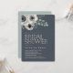 Our elegant floral bridal shower invitations feature a smoky, dark blue grey background with chic cream ivory lettering and a grouping of off white anemone flowers and sage green eucalyptus sprigs in watercolor.