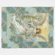 vintage art with painting of an angel in light blue dress floating in the sky among the clouds and holding flowers.