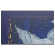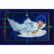 Linda Baysinger Peck’s painting of a white, flying angel, with blue night sky, clouds and stars. Gold metallic look border and scrolls surround the edges.