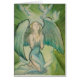 A great illustrative watercolor and ink pen painting for angel lovers. A woman angel with long hair kneels on the ground and releases doves. She is dressed in a turquois, bohemian, hippie styled dress which is long, and has a slit up the side. Her turquoise wings are opened slightly, and her arms are lifted up just a little with open hands. She looks up with a bright and optimistic facial expression, as three white doves above her fly away.The background is shades spring green and yellow-green