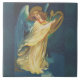 vintage art with painting of an angel with angelic expression, beautiful flowing dress, and golden harp.
