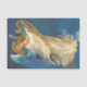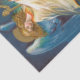 painting of an angel with angelic expression, beautiful  flowing dress, golden harp, wings, gold halo, and blue sky background with a lovely female christian christmas angel with a beige colored   gown and red trimmings that flows with her movement through  the blue sky as she plays a string musical instrument and looks  to the side as her curly hair flows around her. vintage illustrative  painting in blues and beige.
