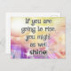 Start your day with positivity with this Angel Rise Shine Colourful Beautiful Watercolor Art Postcard. The uplifting message 'Rise and Shine' is a reminder to embrace each new day with enthusiasm. Send this postcard to inspire and encourage someone special, or keep it for yourself as a daily motivator. Featuring an Angel holding a heart amidst colourful sunbeams in pastel yellow, orange, pink, and blue. Abstract original art by ©Kristy McAdams 2019, features an ethereal backdrop of radiant beams of light. It can be used as a note, affirmation card, or framed for display. I designed this by combining my photography/drawing and adding digital details. Please note that my name and art copyright are on the bottom right corner of the image. May you know the angels that walk beside you! To see more of my designs visit www.zazzle.com/energyofangels