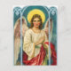 vintage painting of an angel with with a large red ribbon, lovely white smock with gold trimmings and hands together in prayer