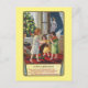 In this vintage Christmas postcard from 1912, angels bearing gifts have entered the house through an open window. One is petting a large pull-toy horse and another is holding a stack of books. In the background, is an old fashioned baby carriage and a Christmas tree lit with candles.