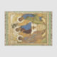 vintage medieval christian painting by andre rublev of his interpretation of the trinity with three angels with golden wings, halo, green, red, and gold cloaks, sitting together around a table. illustrative fine art in golds and greens, in a delicate and refined religious painting.
