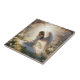 This ceramic tile artwork presents a tranquil and angelic scene. At its centre is a kneeling figure with large, white wings, draped in an off-the-shoulder, flowing white gown. The figure's long hair cascades gently, adding to its serene and celestial presence. The setting is a lush, garden-like space filled with delicate white flowers and abundant greenery, creating an ethereal atmosphere.