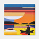 An A.I. created interpretation of a cubist, geometric composition representing the silhouette of an angler wearing a large hat sitting in a small boat with the fishing rod angled over a calm lake reflecting the distant sunset.