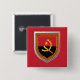 The national flag of Angola is infused into a grey shield shape. Thr inner shield containing the flag is surrounded by outlines decorated in the flag colours.