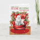 A very pretty white Angora kitty wears a red Santa hat to match a red decorated holiday chair on this feline festive holiday greeting.