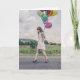A nicely dressed woman carrying bright balloons walks on a roadside. This card is for when birthdays don't go how you expect.