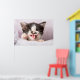 A photograph of a black and white kitten in a box lined out with linen material, climbing out and showing his teeth and nails to the viewer in defence ,