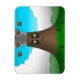This great refrigerator magnet features a cartoon drawing of a cute, erupting volcano with an angry scowl on its face. He stands tall over a green landscape, blasting rock and ash into the sky.