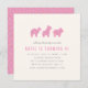 This whimsical party invitation features a trio of sweet animal cookies in the shape of a camel, giraffe, and lion. Each cookie is decorated with bright pink frosting and a few rainbow sprinkles. Underneath the playful illustration is the saying "calling all party animals", followed by the details of the get-together. On the reverse side of the card, there is a simple rainbow sprinkle pattern with the same bright pink background. This design was meant for a kid's birthday party, but I think it would be perfect for a baby shower as well.