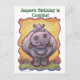 Cute Hippopotamus Birthday Party Invite, or any other party occasion invitation, created by Imagine That! Design features our cute hippo character from our Animal Parade line standing in the grass of the savanna with a dry brush textured yellow, orange sky and a fun wavy purple border painted by our talented children's illustrator, Traci Van Wagoner. Above the fun hippo head are the customisable words in green, Jazper's (change name) Birthday is Coming. On the back, you'll find the backside of the funny water horse with the words in green, Save the Date for a Tail Wagging Party, the date, and Invitation to follow. Make sure to send out these fun animal save the date postcards well before the party to make sure your child's birthday party is a huge success. Create a fun hippo themed party showing both sides, head and butt, in colourful, fun art that will bring a smile to the face of any safari animal lover.