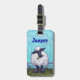 Cute Sheep personal luggage tag features our fun black and white sheep character from our Animal Parade line standing in a grassy field with a white fence behind and an aqua blue textured sky digitally painted by our talented children's book artist, Traci Van Wagoner. For the fun side of you! See the sheep coming and going with this fun artwork of the sheep's head on the front along with your name above the cute ewe, and the sheep's behind on the back with all your information. Our fun sheep tags for bags make great gift for sheep lovers, animal lovers, farm animal lovers, barnyard animal lovers, ewe lovers, and lamb lovers of all ages. Join the Animal Parade and buy an Animal Parade sheep today. Don't just tag your luggage with this cute sheep art, drink from a sheep mug, wear a sheep apron and carry a sheep tote bag! Make some friends and collect the entire Animal Parade barnyard set of cute farm animals -- Pig, Sheep, Cow.