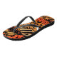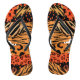 Black flip flops with a wild animal print in orange, tan, brown and black, these are the perfect unique accessory to dress up your outfit for any occasion.