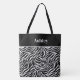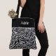 This shoulder tote bag is shown with a cute animal zebra print design and a sample name.