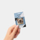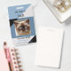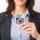 Name badge featuring your own custom photo or logo and texts on a geometric design blue and black background