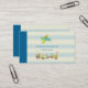 Whimsical business cards with a cute childrens themed nursery art illustration of a little doggy riding in an aeroplane and a toy train filled with whimsical animals. Set on a cream and blue striped background.