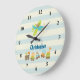A personalised clock with a cute childrens themed nursery art illustration of a little doggy riding in an aeroplane and a toy train filled with whimsical animals. Set on a cream and blue striped background.