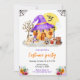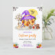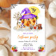 This cute and fun watercolor Halloween party invitation features a pumpkin house and adorable animals in fancy dress. The text combines handwritten script and sans serif fonts for a stylish and modern look. Flower arrangements and spider webs add a rustic and spooky touch. This is perfect for a costume party or trick and treating.