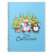 A cute, colourful Christmas holiday design notebook featuring a polar bear, penguin, and mouse all with scarves and ice skates with snow covered trees and text that reads It's Christmas!