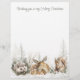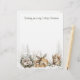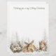 This design features a watercolor illustration of a deer, a squirrel, and a hedgehog in a winter snowy forest.