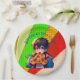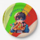 Personalised birthday boy paper plates for a boy's pizza birthday party. Cute anime boy holding a piece of pizza with a colourful pop art background.
