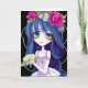 Cute anime inspired bridal party proposal card, with cartoon graphics of a, blue haired, big eyed bridesmaid, against a black background. Will you be my bridesmaid or maid of honour card ready to personalise for each of your friends.