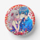 Anime boy and girl cuddling surrounded by colourful flowers. Cute anime couple, girl with pink hair and boy with blue hair. Colours are red, blue, white, pink and purple. Pretty for weddings, Valentine's Day or an anniversary.