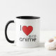 This "I love anime" or "I Heart anime" design has a modern rounded black font and a large red heart. It also shows the word "anime" in Japanese Hiragana grey font.