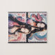 8x10 with 110 pieces. easy to put together. Easy to frame when done. Anime Postage Stamp Puzzle