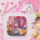 Pretty anime themed birthday paper plates. Cute graphics of a beautiful anime girl with purple hair surrounded by balloons and pink and purple flowers. These are cute for a teen or pre-teen girl.