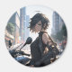 Anime style painting of a young woman with short black hair in a black outfit standing by her black motorcycle on a bustling city street.
