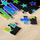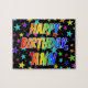 This lively, vibrant, birthday-themed jigsaw puzzle design has the message "HAPPY BIRTHDAY, ANN" with the characters having a colourful rainbow spectrum inspired gradient pattern, along with a fun star shapes background pattern. An exciting puzzle like this might be a fun way to send a birthday greeting message to somebody named Ann. [~Z0000468]