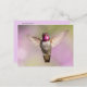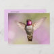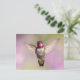 Postcard featuring an anna's hummingbird in flight against a purple and green background, with its wings wide open, looking directly at you. You can see the details of his magenta pink throat feathers (gorget). Beautiful card for bird, garden and nature lovers. Photo taken in Arcadia, California.